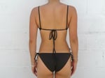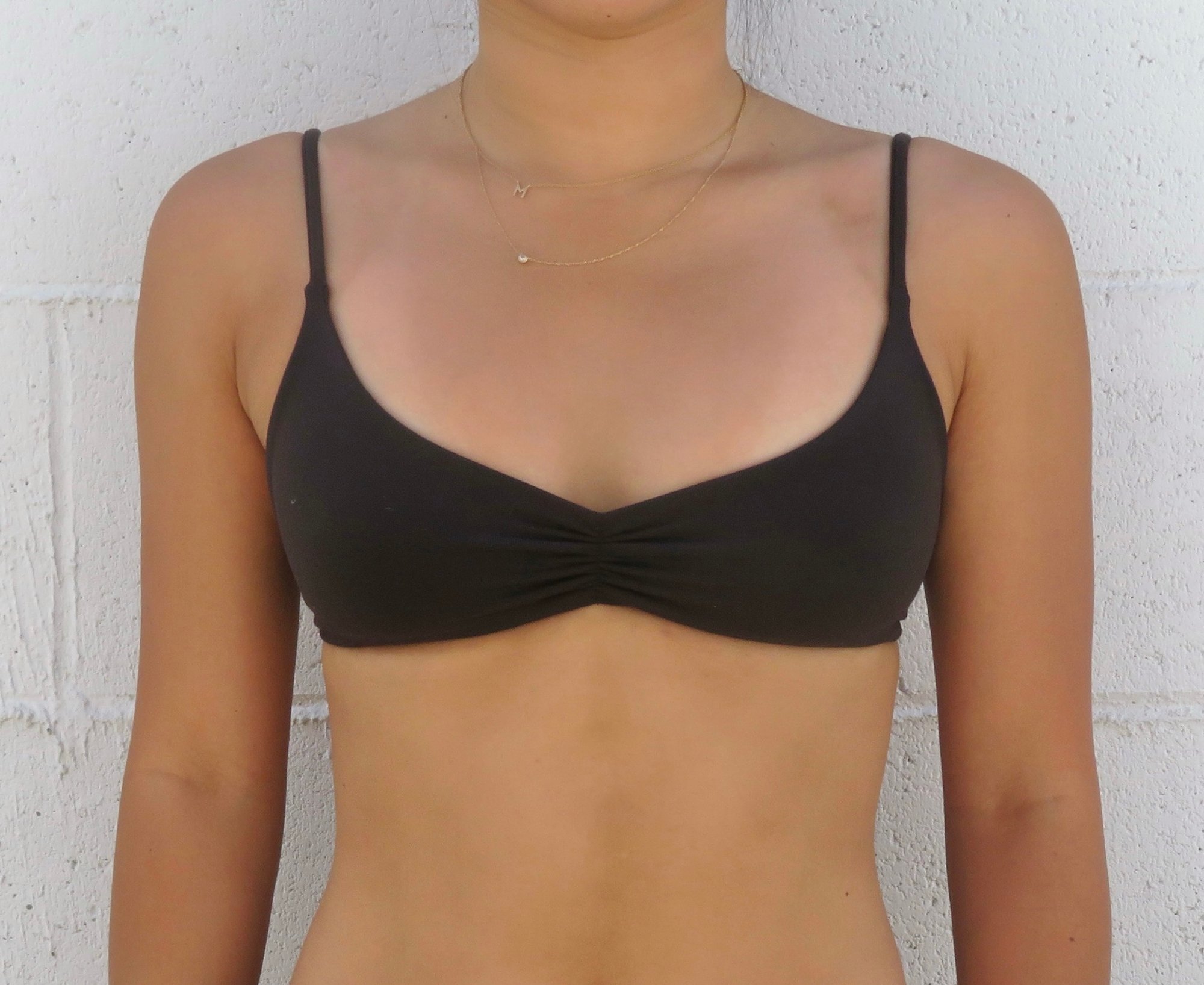 Our Semisweet Ruched Bikini Top is made from a luxurious cool-toned chocolate brown fabric. The top features a scoop neck cut with ruching in the center and ties that frame the back. Double lined and handmade with love in LA from entirely deadstock fabrics.